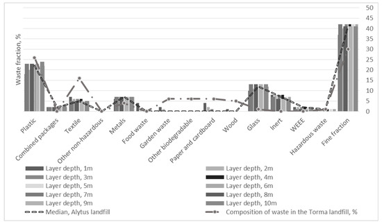 As evident from Figure 4, different fractions were changing in different ways. The percentage of non-degradable fractions (plastic, combined, metals, glass, inert, WEEE (Waste Electrical and Electronic Equipment), hazardous waste, and fine fraction) increased over time, while the others (partially degradable textile, food and garden waste, paper and cardboard, wood, and other biodegradable) were decreasing. This was due to biodegradation of the latter fractions, with part of the organic matter leaving the landfill as gases and leachate. The amount of completely degraded organic matter is accounted for in the fine fraction, the percentage of which also increased at the expense of cover material. A comparison of the calculated waste composition in the Alytus landfill and the actual waste composition in the Torma landfill is presented in Figure 5.