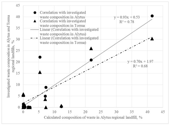 Comparison of correlations between median of calculated waste composition in the Alytus landfill and medians of waste compositions excavated from the Torma landfill and the Alytus landfill.