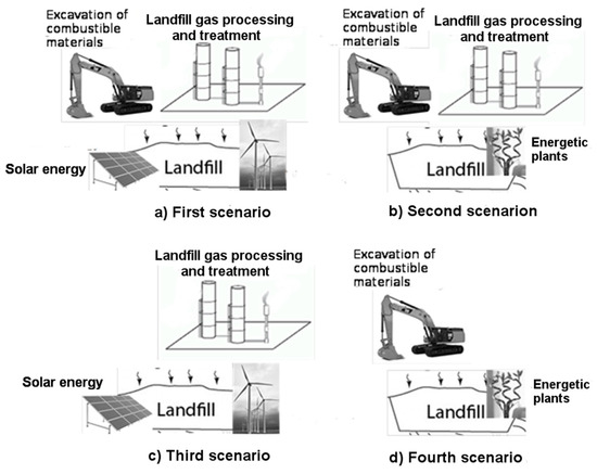 Schematic illustration of the four scenarios: (a) landfill gas + excavated combustibles + wind/solar; (b) landfill gas + excavated combustibles + energetic crops; (c) landfill gas + wind/solar; (d) excavated combustibles + energetic plants.