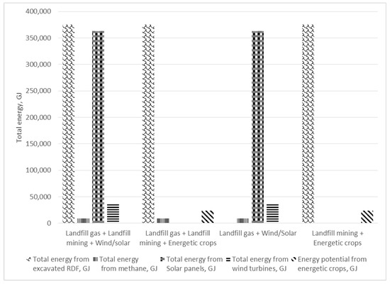 The results of the calculations from the different scenarios are presented in Figure 8. It is clear that the largest total amount of energy comes from the incineration of waste, which is obtained from LFM, followed by energy from solar panels, then in descending order by energy from wind turbines, energetic crops, and methane extraction. All results are true only with current input parameters (e.g., duration of energy generation by wind turbines).