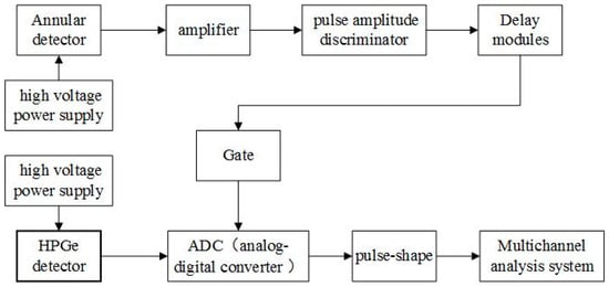The anticoincidence measurement system developed in this study consists of a main detector and an annular detector. During measurement, the γ-rays emitted by radionuclides hit the HPGe detector to generate pulse signals, and the scattered photons escaping from the main detector will enter the peripheral anticoincidence detector and generate anticoincidence pulses. If both the primary detector and the anticoincidence detector output a signal at the same time, the signal pulse is not recorded. The signal pulse is recorded only when the main detector has outputs. In this way, because the signals generated by escaping photons, such as Compton photons, are not recorded, the Compton plateau is greatly reduced by anticoincidence, which improves the nuclide measurement accuracy. The working principle of the system’s anticoincidence measurement process is shown in Figure 2.