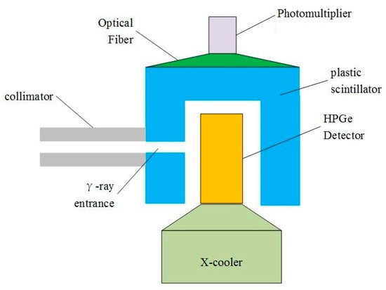 The P-type HPGe detector used in the main detector had an energy resolution (full-width at half maximum) of 1.85 keV for a 1332 keV γ-ray from Co-60 and relative efficiency of 30%. The aluminum shell (end window) diameter was 76 mm, the end window top and side wall thicknesses were 1 mm, and the distance between the top of the probe crystal and the aluminum protective shell was 4 mm. The side wall thickness of the aluminum cup was 0.8 mm, the probe crystal end was 62.6 mm in diameter, the crystal annular thickness was 25.9 mm, and the center (electrode) hole of the probe crystal was 0.8 mm. A simplified model of the anticoincidence measurement system is shown in Figure 3.