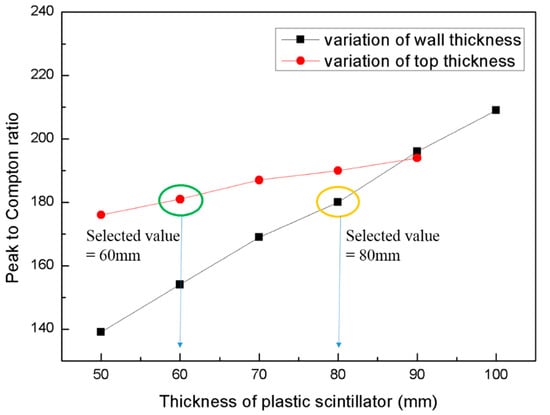 - When the wall thickness of the plastic scintillator increased from the value of 50 to 100 mm, the P/C of the system increased by 70. For every 10 mm increase in wall thickness, the mean increase of the P/C of the system was 14. After the wall thickness increased to 80 mm, the growth trend of P/C gradually leveled off. The geometric size producing the best anticoincidence effect was estimated to consist in a diameter of 260 mm and a length of 260 mm, and its P/C is 180.