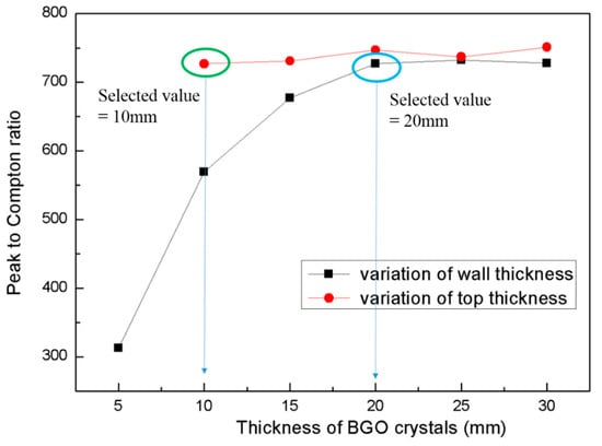P/C of the system with increasing bismuth germanium oxide (BGO) detector wall thickness.