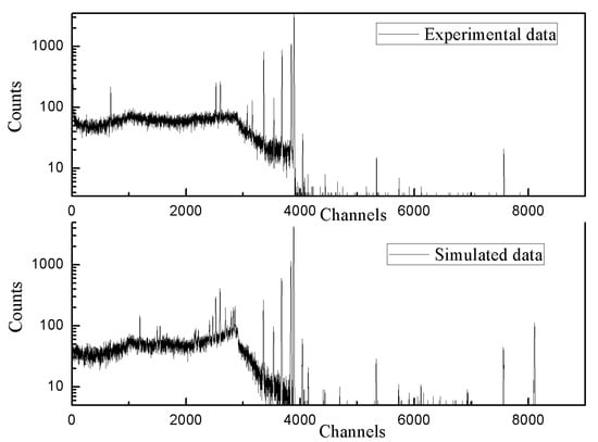 To verify the reliability of the simulation, the simulated data and the data measured by the HTR-10 burnup measurement system were compared, as shown in Figure 8. As can be seen in the figure, the Compton plateau for counts of the two spectra is slightly different because the actual measurement is far more complex than the simulation. The actual measurement environment contains natural radionuclides and other radioactive materials, and the effects of these conditions cannot be accurately simulated by the Geant4 software. Additionally, the peaks in the simulated spectrum are in good agreement with the actual measured peaks of the energy spectrum, which also proves that all simulations performed in this study are accurate and reliable.