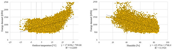 Figure 6 and Figure 7 present the relationship between meteorological parameters and energy demand as scatter plots. As can be observed, an interesting relationship emerges between energy demand and irradiation and temperature. Namely, after exceeding a certain temperature threshold the energy demand starts to increase very rapidly (Figure 7, Figure 8 and Figure 9, charts–upper left corner). This results from the fact that the high outside air temperature requires the cooling processes inside the building to be intensified to maintain the required thermal comfort. In general, it can also be noted that there is a greater energy demand when humidity is low (especially lower than 50%) and energy demand tends to increase with increasing irradiation. However, for each scatter plot for which a linear trend line has been added, the coefficient of determination is lower than 0.5, which indicates that the fit is relatively low and this meteorological parameter does not satisfactorily reflect energy demand.