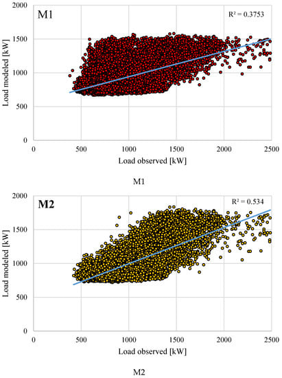 In Figure 12, scatter plots for all the considered models have been presented. As can be observed, the models exhibit relatively low values of the coefficient of determination (R2) which ranges from 0.37 for M1, through 0.43 for M3 and 0.53 for M2, indicating that based on the available independent variables the model can explain up to 53% of the variability in the response data (dependent variable) around its mean. What is also visible from the charts presented in Figure 12 is that the models were not capable of accurately modeling the highest values of the power demand.