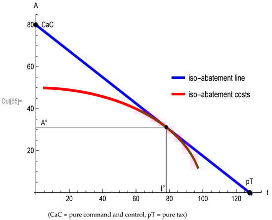 Similarly, we can draw iso-abatement-costs curves by utilizing Equation (15). Iso-abatement cost curves can be obtained by inserting Equation (30) into Equation (15) for a predefined cost level . The red curve gives the iso-abatement cost curve for the cost level which relates to the optimal solution characterized by Equation (20) and Equation (23). Iso-abatement curves to the southwest (northeast) represent lower (higher) costs. The optimal policy mix is located where the slopes of both curves are equated. Figure 1 also enables us to demonstrate the findings of Result 1. A pure tax policy approach, i.e. (see Equation (16)), leads to a tax rate that is higher than the optimal tax rate. Vice versa, the abatement provision given by the pure command and control approach, i.e. A is such that (see Equation (17)), is higher than the green default . Needless to say, points (pT) and (CaC) lead to higher aggregate abatement costs than under the optimal policy mix.