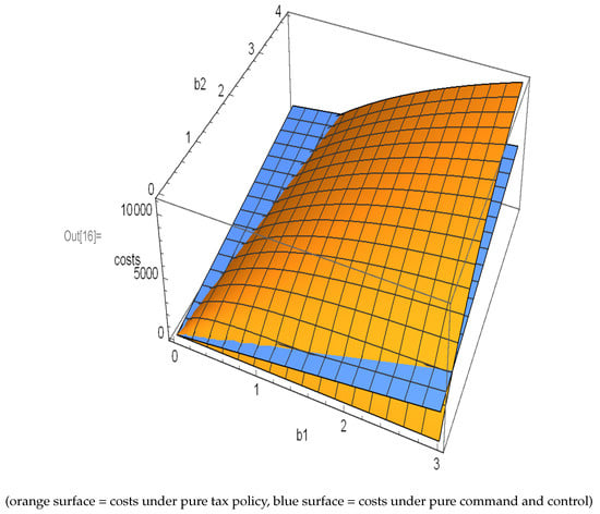 Abatement costs for passive emitters are nil, since . They simply pay the full tax burden on their unreduced emissions baseline (). Notice that in these partial equilibrium models, it is assumed that tax receipts are returned to the emitting industry sector on a lump-sum basis. Notice further that the aggregated abatement costs depend on technologies () and on the proportion of rational emitters. The surface is drawn as a function of and . Similarly, total abatement costs under a command and control approach can also be derived (blue surface). Utilizing the abatement cost functions and Equation (17), we get