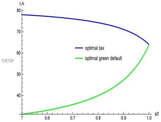 The first assertion simply states that both instruments should be utilized. Price responsive firms react to the tax rate and passive emitters follow the green default. Since aggregated abatement costs are to be minimized, both instruments are deployed such that the marginal abatement costs of both behavioral groups are equated, as stated by the average marginal abatement cost rule Equation (A2). Figure 1 illustrates this finding. The AMAC-rule is satisfied at the point . From Figure 1, one also can easily see that . In the pure tax approach, the tax rate is chosen such that the abatement target is achieved (point pT). The tax rate must be set rather high to meet this target. Aggregated abatement costs can be reduced by lifting the abatement level of passive emitters and thereby making it possible to reduce the tax rate.