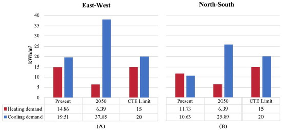 Energy demand for current and 2050 climate scenarios, compared to current regulatory requirements (CTE Limit). (A) East-West orientation. (B) North-South orientation.