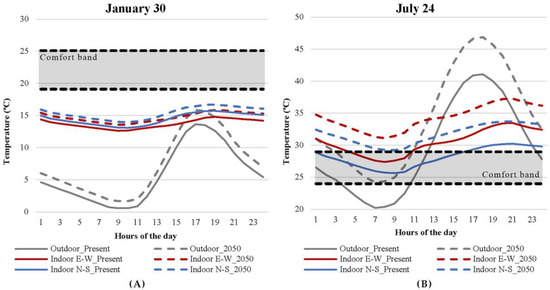 As Figure 4 shows, the new climate scenario results in an increase in outdoor temperatures. On the winter day represented there is an increase of 1–2 °C, which becomes more significant in summer, with an increase of 6 °C during the day (reaching 47 °C) and of 4 °C during the night (with a minimum value of 24 °C). This outdoor temperature increase clearly affects the indoor operative temperatures. While in winter indoor operative temperatures barely increase by 1 °C, in summer climate change influence is much more noticeable, causing an increase of around 3–4 °C, with the highest temperatures found in the East-West orientation.