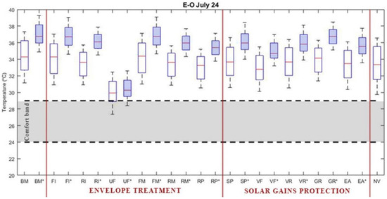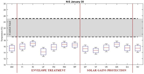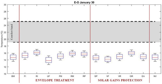 In winter (Figure 5 and Figure 6), the solutions with the greatest effect on indoor conditions are the thermal insulation increase on the roof (RI) and the green roof (GR), which raise average indoor temperatures by up to 1.5 °C. Despite these improvements none of the individual strategies successfully increase indoor temperatures enough to ensure comfort conditions, and at best average indoor temperature is maintained at around 16 °C. It should also be noted that some of the proposed solutions—the uninsulated ground floor (UF), the solar protection (SP) and the ventilated façade (VF)—involve a slight worsening of indoor conditions (average indoor temperature drops by less than 1 °C). Solar protections could be deactivated during winter time, but not the other two strategies. In general, the indoor thermal conditions in the North-South orientation are slightly better than in the East-West orientation, although the differences in the average temperature do not exceed 1 °C.