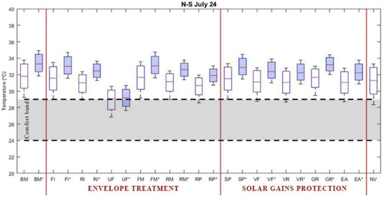 Daily fluctuation of the indoor operative temperature in the 2050 climate scenario with passive conditioning solutions. Summer, North-South orientation. NOTE: XX * (filled boxplot) is the XX passive conditioning solution but without night-time natural ventilation. LEGEND: Base Model (BM); Façade Insulation (FI); Roof Insulation (RI); Uninsulated Floor (UF); Façade thermal Mass (FM); Roof thermal Mass (RM); Roof Pond (RP); Solar Protection (SP); Ventilated Façades (VF); Ventilated Roofs (VR); Green Roofs (GR); Envelope absorptivity (EA); Natural Ventilation (NV).