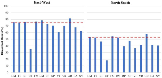 In order to complete the environmental analysis, the effect of the passive conditioning solutions proposed (with night-time natural ventilation) on comfort is evaluated throughout the summer period (June–September). Table 4 and Table 5 show the maximum and minimum indoor operative temperatures, the percentage of hours outside the comfort temperature band and the average deviation of the indoor operative temperatures (in the periods of discomfort) with respect to the upper limit of the comfort band. As can be observed, the effect of passive conditioning solutions is not exactly the same when evaluating temperature and percentage of hours of discomfort (Figure 9). The solution with the greatest improvement in comfort conditions in summer is that of the non-insulation of the ground floor (UF), which causes a reduction of around 40% in the hours of discomfort in the model with the East-West orientation (which goes from 75% in the base model (BM) to 35% in the UF model) and a reduction of 1.9 °C in the average deviation of the indoor temperatures with respect to the upper limit of the comfort band (from 3 °C in the BM to 1.1 °C in the UF model). The following most effective measures in terms of comfort are the ventilated façade (VF), the increase in night-time natural ventilation rate (NV) and the envelope absorptivity reduction (EA), which result in decreases in the percentage of discomfort hours in the range of 8–17%.