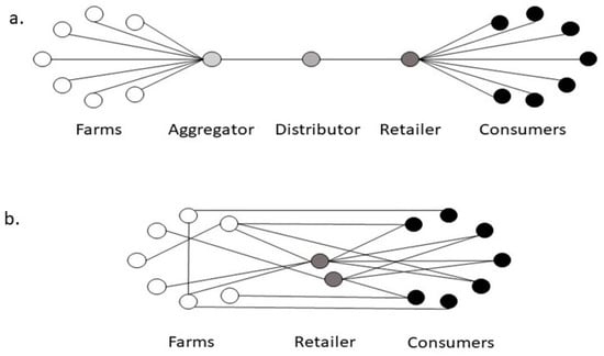A growing body of literature and practice draws ties between local food systems and building sustainable futures for human health [1,2,3,4], education [5], land management [6,7], and economies [4,8,9]. This research posits that alternative food networks (AFNs) structurally differ from their globally-reaching counterparts (Figure 1). A better understanding of AFN architecture could provide insights into its development, growth, and resiliency for meeting the above sustainability goals. More broadly, the food system is often conceptualized as a network of nodes represented by producers, processors, distributors, and consumers. Connections between the nodes are referred to as ‘edges’ (for a review of network analysis and graph theory, models, and study see [10]). AFNs are characterized by transparent, often direct marketing of food [11,12,13,14]. In AFNs, transparent edges between producers and consumers are emphasized as important to tighten feedback loops between diets, consumer demand, land management, and economic investment in sustainable practices, as trust is re-discovered between producers and consumers [15,16,17]. The proclaimed benefits to future generations are manifold, from healthy diets impacting epigenetics over several generations [2,3,5,12,15] to land-use that guides compact urban development while protecting long-term soil health with more agroecological farming practices [6,7,12].