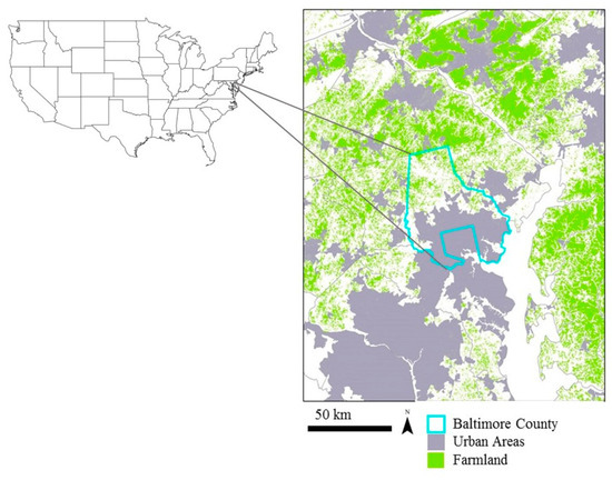 Baltimore County urban areas (gray) and agricultural land (green) according to 2012 National Agricultural Statistics Service and 2010 United States (U.S.) Census data. The county boundary is outlined in blue.