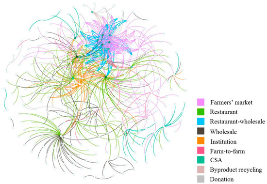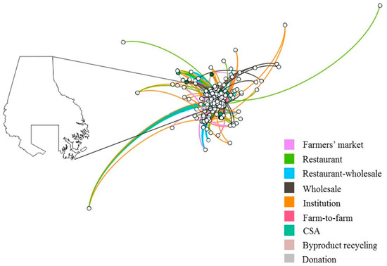 AFNs are growing, as evidenced by data from the global north. About 7% of United States (U.S.) farms direct marketed to consumers in 2012, twice as many as in 2004 [51,52,53]. This growth has promoted a suite of new agricultural survey and census questions, with results released in 2016 [53]. Providing only an estimated 1.5% of the total U.S. agricultural production value [53], the promise of social change is still largely nascent. Surveys also reveal spatial patterns. The majority of community support agriculture sales and farmers markets in the U.S. are in the northeast and west coast, near major metropolitan areas [51,52,53]. The extent of a local food system’s reach from farm-to-fork, directionality, and magnitude are yet unknown. It has been nearly 20 years since Jarozs [6] called for the combined use of network theory and supply chain management theory to understand regional agri-food systems. A better understanding of the network structure may help elucidate opportunities and the extent of the total AFN growth.