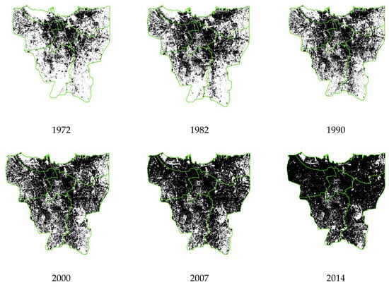 Maps illustrating the urban expansion, in black, in Jakarta from 1972 until 2014.