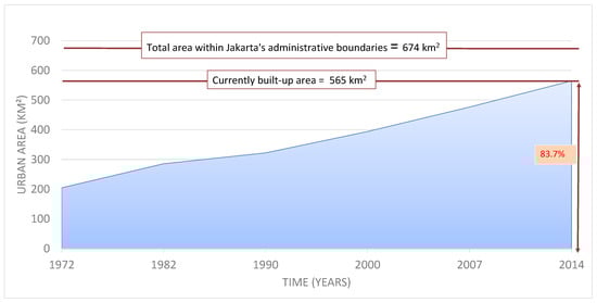 However, the flooding problem has been greatly intensifying over the recent decades, mostly due to anthropogenic drivers. First, the city has been experiencing a massive growth in population and economic as well as industrial activity since the second half of the 20th century. Being the capital of Indonesia and its clear center for economic, political, and cultural activities (especially during the centralistic Suharto regime) Jakarta’s population has grown to well over 10 million today, from around 3 million at the early 1960s [35]. Along with this growth, the city has been experiencing an extensive spatial expansion. Figure 1 illustrates this expansion from 1972 to 2014. The analysis shows that urban land use within Jakarta’s administrative boundary has increased by 276 percent over the last four decades, consuming 565 km2 of the 674 km2 available space, i.e., over 83 percent (Figure 2).