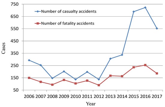 With the rapid economic development in China, there are surging demands for hazardous chemicals for use in manufacturing and everyday life. Such chemicals pose considerable risks to safety and the environment, despite their benefits. Based on the accident statistics, 3974 hazardous chemical casualty accidents occurred in the 12-year period from 2006 to 2017, resulting in a total of 5203 deaths. Thus, on average, there is almost one casualty accident per day and more than one death each day. Since 2013, major accidents, which are defined as more than or equal to 3 deaths based on the Chinese classification standard “Production Safety Accident Investigation and Handling Rules” [1], and catastrophic accidents have occurred continuously. On 22 November 2013, an explosion caused by an oil pipeline leakage in Sinopec killed 62 and injured 136 people. On 1 March 2014, two tankers loaded with methanol crashed in a highway tunnel in Shanxi Province and the resulting explosion killed 40 people. On 12 August 2015, in Tianjin, catastrophic explosions occurred at midnight in warehouses where significant amounts of toxic chemicals were stored, killing 178 people, injuring 677 people, and resulting in a severe biochemical crisis [2] These hazardous chemical accidents (HCAs) have a huge impact on environmental health, safety, and sustainability. The management of hazardous chemicals poses serious challenges to central and local government departments. There is an urgent need to learn from past HCAs and improve safety management.