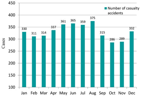 The average monthly distribution of the 3974 casualty accidents is summarized in Figure 3. The accidents show seasonal variance. There are more accidents in months from April to August than in the other months in the year. From May to August, more than 350 casualty accidents occur each month. This is mainly related to the weather in China. In most parts of China, spring and summer are the seasons with the most rain and the highest temperatures, while autumn and winter are the seasons with clear days and low temperature. On warm and humid days, the likelihood of casualty accidents increases. Weather, as an external factor, significantly affects the number of incidents. Of the winter months, December and January have relatively more accidents. This is because prior to the Spring Festival, there is usually a large demand for hazardous chemicals, such as fire crackers. Moreover, road traffic is often busy during this time period. Additionally, as the Spring Festival holidays approach, safety management is relaxed and workers’ safety consciousness is quite low. All of these factors lead to an increase in the number of accidents, even on cold winter days.