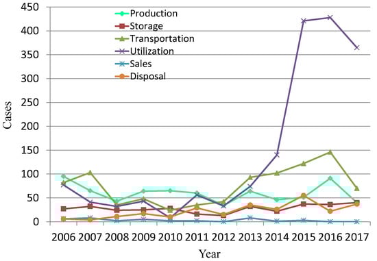 The trends of casualty accidents occurring during different lifecycle stages are not the same (Figure 5). The number of casualty accidents occurring during sales displays a downward trend while the number of casualty accidents occurring during production and storage fluctuates. Moreover, the number of casualty accidents during utilization, transportation, and disposal increases. This is primarily because safety management efforts are devoted to the production, sales, and storage of hazardous materials but not to the utilization and disposal of hazardous materials, as we mentioned above. Therefore, safety management should focus more on the management of utilization, transportation, and disposal of hazardous chemicals. Meanwhile, one integrated system for tracking hazardous chemicals from production to disposal is needed to ensure the seamless control of hazardous chemicals.