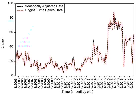 Due to the seasonal characteristics of casualty accidents, the original time series data need to be adjusted to remove the seasonal factors first. In general, there are two main approaches to the seasonal adjustment, namely a filter-based approach and a model-based approach. To understand how to implement the seasonal adjustment, interested readers can consult Hillmer and Tiao [40], Findley and Hood [41], and Birrell et al. [42]. In this paper, the model-based approach is used. The prediction of the number of casualty accidents in 2018 is based on the adjusted data using model ARIMA. The calculated number of casualty accidents must be re-adjusted to account for the seasonal characteristics.
