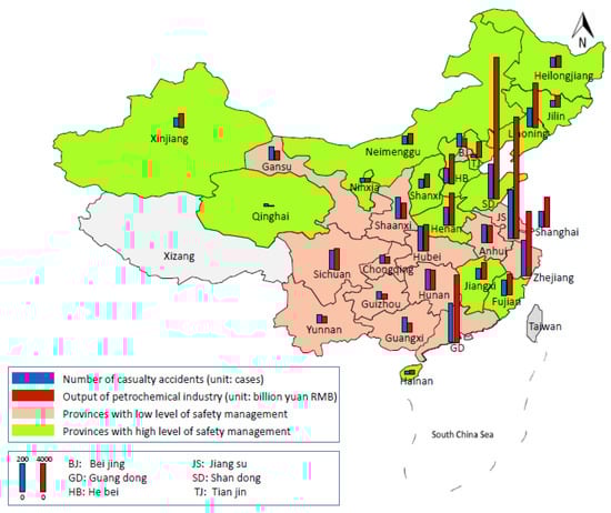 Figure 7 shows the total number of casualty accidents and the total output of the petrochemical industry for each province in China from 2006 to 2016. Obviously, Shandong, Jiangsu, Guangdong, Zhejiang, Liaoning, Henan, and Shanghai have a stronger petrochemical industry than other provinces. Meanwhile, there is a significant imbalance in the number of casualty accidents in different provinces and regions. For example, casualty accidents occurred primarily in the southeastern coastal provinces, where economic development is more rapid. Jiangsu, Guangdong, Zhejiang, and Shandong are the top four provinces for casualty accidents. The number of casualty accidents in these provinces exceeds 240. The provinces located in the northern and western parts of the country have fewer casualty accidents, and their economic development is relatively slow. Economic activities, especially those related to hazardous chemicals, such as the production, storage, transportation, sales, utilization, and disposal of hazardous chemicals, have the potential to generate HCAs. Therefore, the number of HCAs or casualty accidents alone cannot represent the safety management level. The level of economic development should also be considered when the hazardous chemical safety management level is evaluated.