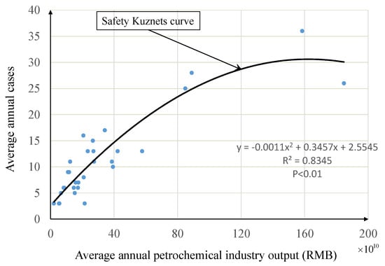 Normally, when the output of the petrochemical industry of a province is low, there are fewer economic activities related to hazardous chemicals. Therefore, the number of HCAs will also be low. With the expansion of the petrochemical industry, transitions with hazardous chemicals will increase. Thus, the number of HCAs will also rise. One way to reduce the number of HCAs is better safety management. However, investment in safety management is often delayed. When the petrochemical industry is well-developed, safety management will mature and the number of HCAs will fall. Therefore, the number of HCAs should have an inverted U-shaped relationship with the output of the petrochemical industry. We call this the safety Kuznets curve and use the quadratic function regression to fit the relationship between and , as shown in Equation (4):
