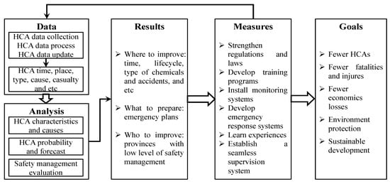 The rapid development of the petrochemical industry in China has brought with it greater challenges from HCAs. Currently, China lacks systematic safety management of hazardous chemicals. A framework for continuous improvement of safety management is proposed in Figure 9. HCA analysis reflects when and where HCAs frequently occur, indicating where greater efforts in safety management are necessary. The probability and forecast of HCAs show the potential for accidents to occur in the future, helping managers to prepare for accident prevention and to increase awareness and improve the response capacity. The safety management evaluation shows the safety management level of each province, identifying provinces that need to improve safety management. When safety management measures are implemented, the characteristics of HCAs can be changed. Therefore, further data collection, analysis, forecast, and evaluation should be conducted to identify new safety management measures. With this continuous safety management improvement process, we can expect to have fewer HCAs, less severe HCAs, and better environment protection and sustainable development.