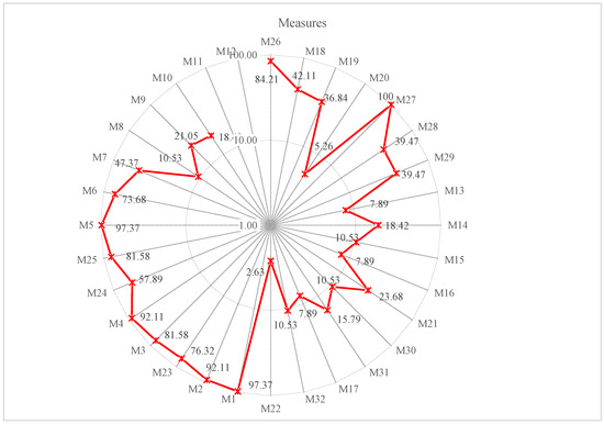 Economic measures refer to economic instruments that motivate contractors to mitigate the emission of construction dust. As given in Table 6, this kind of measure encompasses administrative sanction, special funds, budget management, and sewage charges. In particular, governments will possibly conduct administrative sanctions (M26) if contractors’ behaviors are under an administrative violation. By comparison, less application of either M19 or M20 might be because they are newly established and more time is needed to embrace them in practice.