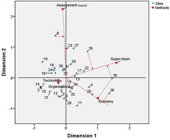 Correspondence analysis (CA) is an interdependence technique for dimensional reduction and perceptual mapping [72,73]. Hill [74] used CA to identify those species that are preferential to certain types of habitat. Hoffman and Franke [75] applied CA to develop preferred solutions for an energy crisis. In this study, therefore, CA was employed to identify governmental tendencies in the determination of construction dust control measures. In effect, this approach is useful to extract a continuous axe of variations from abundant data [76]. The total inertia explained by the axes retained reflects the accuracy of the lower dimensional space representation. The first two principal axes account for major variations in the original data, which can give rise to dimension reduction [77]. A graphical representation is obtained by plotting the first two columns of F (representing row points) and G (representing column points). The resulting plot facilitates simultaneous analysis of associations among rows, among columns, and between rows and columns. Thereby, the potential relationships among variations can be derived [78].