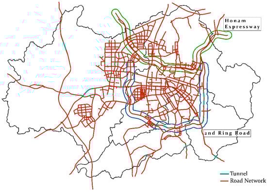 The total length of roads was reported to be 1,832 km in 2015; spatial distribution of the road network is shown in Figure 2. In the figure, most tunnels marked in cyan color were developed beneath mountains. A beltway, called the 2nd Ring Road, passes around residential areas of the city. In addition, a highway called the Honam Expressway, runs through two districts of Buk-gu and Gwangsan-gu. The speed limits of the two roads are higher than those of the others.