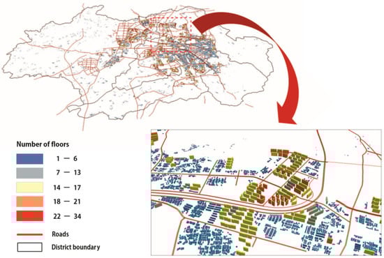 Figure 3 provides the geographic distribution of 131,078 buildings in 3-D (based on the number of floors). Over half of the buildings were found to be located in Gwangsan-gu and Buk-gu with percentages of 26.6% and 25.0%, respectively. Nam-gu followed them with 19.3%, and the other two districts had around 14.5% of the total number of buildings.