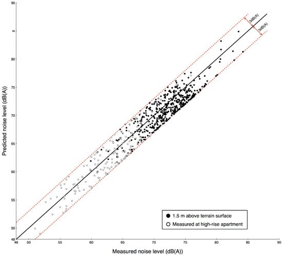 The RLS90 model was tested by comparing predicted levels with measured levels, as shown in Figure 4. The noise levels were measured at a total of 604 points, including 456 points at 1.5 m above the terrain surface and 148 points at the facade of high-rise apartment buildings. We measured noise level at each point for one hour and also collected traffic volume, speed and vehicle type. The assessment result of noise prediction accuracy is presented in Figure 4. It was discovered that the differences between predicted and measured noise levels were within ±3 dB(A).