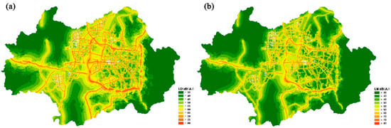 Road traffic noise maps of Gwangju Metropolitan City: (a) daytime and (b) nighttime.