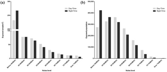 Figure 6 shows the areas and the populations of the GMC exposed to daytime and nighttime road traffic noise. In the figure, the noise levels of 23.9% of GMC area exceed 55 dB(A), the daytime recommended level by WHO [1] and 34.7% of population are exposed to the exceeded levels. In addition, WHO recommends 45 dB(A) for nighttime and the corresponding rates for the exceeded area and population of GMC were 46.8% and 71.3%, respectively.