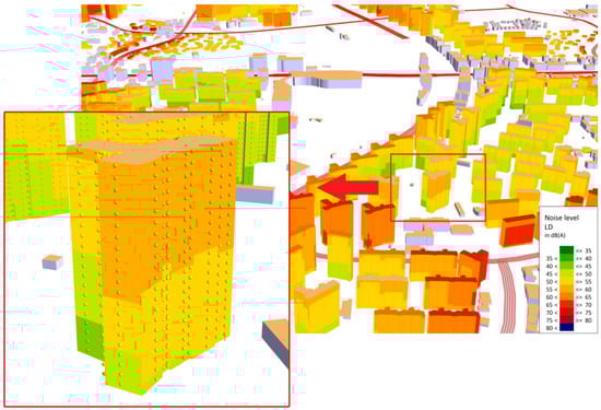 The health impacts of road traffic noise need to be assessed with facade noise maps, instead of grid maps, considering noise propagation in a real-world human settlement environment. Therefore, this research adopted facade maps with day-night and nighttime noise levels to calculate %HA and %HSD, respectively. Figure 7 illustrates facade noise maps for a portion of the study area.