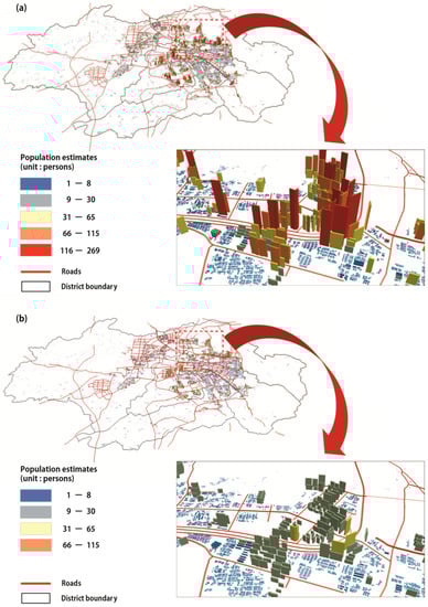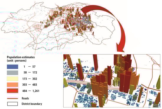 This research predicted the population estimates of each facade for individual floors of buildings, as described in Section 2.4. The total number of people per building was then derived by summing all facades estimates, as shown in Figure 8. Individual polygons were extruded with their predicted populations for a presentation purpose. In Figure 8, the tall buildings are apartment houses with a larger number of people than blue-colored detached houses.
