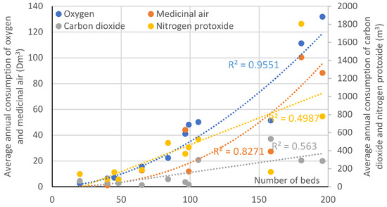 No statistical correlation was achieved between the number of beds and the consumption of carbon dioxide or nitrogen protoxide (R2 = 0.5630 and R2 = 0.4987, respectively).