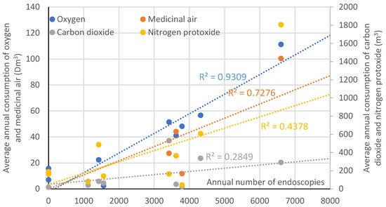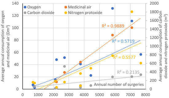 Oxygen and medicinal air consumption rates were seen to be highly correlated to the number of workers (R2 = 0.9161 and R2 = 0.8213), but no correlation was achieved for carbon dioxide or nitrogen protoxide (R2 = 0.5617, R2 = 0.6771).