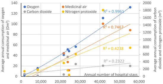 No correlations were evidenced between the number of hospital stays and the rest of the medical gases under study, namely medicinal air, carbon dioxide and nitrogen protoxide (correlation indexes R2 = 0.7467, R2 = 0.2322 and R2 = 0.4238, respectively).