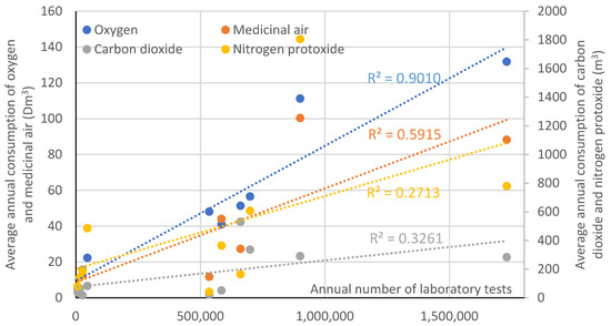 The potential correlation between the medical gas consumption rates and the number of laboratory tests carried out in the set of hospitals was also assessed. However, no correlation evidence was found for the cases of medicinal air (R