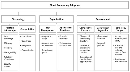 Low et al. [29] suggested an underlying model for cloud computing adoption which was validated by the TOE (technology, organization, environment) framework. After it developed between the moderating effects of IT governance structures and processed on these relationships in detail [32]. Alshamaila et al. [33] attempted to explore and develop an adoption model of cloud computing for small and medium business. Gangwar et al. [23] attempted to build a TAM(Technology Acceptance Model)-TOE framework for cloud computing adoption. Zardari and Bahsoon [34] suggested a goal-oriented approach for cloud adoption. The approach included requirements for engineering steps, categories of goals, and steps for cloud adoption. They proposed a toolkit that decision-makers can use to identify their risks and coordinate suitable tools and techniques [35]. A recent study of cloud adoption was conducted in terms of a national perspective and small and medium enterprises [33,36,37], and the case studies described the direct influences of cloud computing on the organization in a wide range of activities, including global enterprises [38,39].