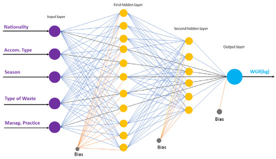 In this study, MATLAB R2017a software (MathWorks, Inc., Natick, MA, USA) was utilised to predict the waste generate rates (WGR) of various classes of accommodation sectors in TRNC. A multilayer ANN architecture was utilized and bias neurons were added to each layer to avoid network collapse. The connecting weights were randomly chosen and changed through the training procedure to obtain the minimised mean squared error (MSE). The developed ANN architecture was utilised to investigate the association between inputs and output (waste generation rates), as depicted in Figure 1.