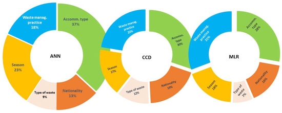Figure 5 shows the relative significance of the independent variables on the response (WGR) obtained from Equation (10). It is important to stress that all the input variables had an impact on the waste generation rates. However, the accommodation type (B) seemed to be the most influential variable on WGR, while the second most influential variable was the season (C), followed by waste management practice (E), nationality (A) and type of waste (D), according to ANN. Meanwhile, the CCD and MLR tend to deviate slightly from the ANN predicted data, as shown in Figure 5. The desirability function (D) was applied to select the acceptable ranking and the minimum, middle and maximum values of desirability were configured as D = 0.0, 0.5 and 1.0, respectively. A desirability value closer to 1.0 means that the corresponding sensitivity analysis is able to represent the actual scenario. Hence, the ranking based on the models is as follows; ANN (D = 0.99) > CCD (D = 0.78) > MLR (0.65). It is inferred that the ANN can be employed to simulate and predict the complex independent variable behaviour in any form of non-linearity and can effectively overcome the limitation of quadratic correlation assumed in CCD and MLR.