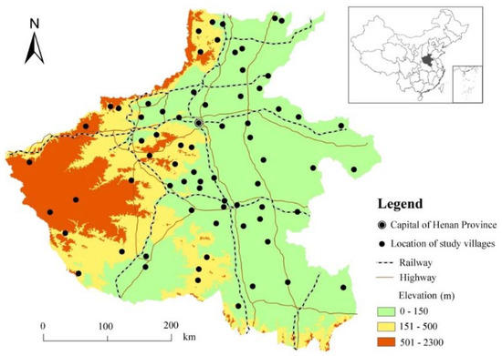 Henan Province is located in the central part of China, and has a diverse landscape, with mountains in the west and floodplains in the east (Figure 1). Henan Province has the nation’s highest wheat output and second highest rice output, which is the reason that it is known as the “breadbasket of China”. In 2016, the permanent urban population of this province was only 48.5%, while the urbanization rate of China reached 57.4% in the same year. In Henan, the average peasant has only 0.26 ha of agricultural land, and 25.7 million peasants left their home villages and towns to seek off-farm employment opportunities in 2012 [30].