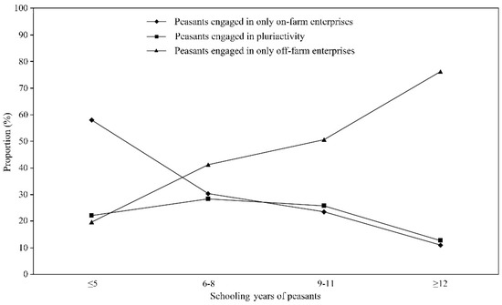 Figure 3 shows that as age increases, the proportion of peasants engaged in only off−farm employment decreases, the proportion of peasants engaged in only on-farm employment drastically decreases, and the proportion of peasants engaged in pluriactivity first increases and then decreases. Figure 4 shows that as educational years increases, the proportion of peasants engaged in only off-farm employment increases, the proportion of peasants engaged in only on-farm employment shows a downward trend, and the proportion of peasants engaged in pluriactivity first increases and then decreases.