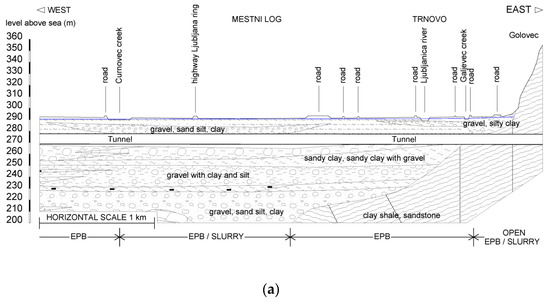Typical geological cross sections for (a) the Ljubljana Marshes and (b) the Ljubljana Polje and selection of the appropriate TBM technologies for excavation at tunnel level.